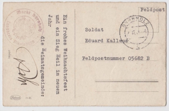 pohlednice z Drnholce vojákovi E. Kallausovi na polní poštu