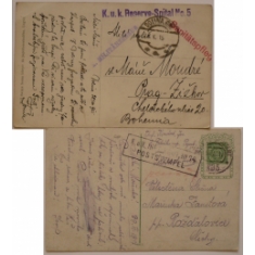 K.u.K. RESERVE-SPITAL No.5, podací razítko DOLINA 28.V.15; K.u.K. INFT. RGMT. No.74, FP ?05/ 30.VII.17; hezké