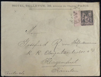 MICHEL 80, Alegorie 25c s kupónem, razítko PARIS, příchozí razítko KLAGENFURT; vzadu popsaný