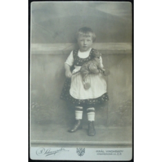 dítě s plyšovou kočkou na kolečkách, formát 10,5x16cm, ateliér Schumpeter, Královské Vinohrady; bezvadné