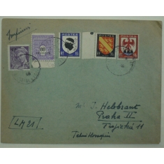 hezká smíšená frankatura, vzadu příchozí razítko PRAHA 8.X.46; dekorativní