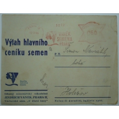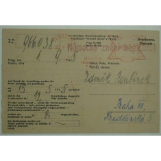 předtištěný česko-německý korespondenční lístek s otiskem výplatního stroje VŠEOBECNÝ PENSIJNÍ FOND PRAHA 20.9.45; zajímavý dokument