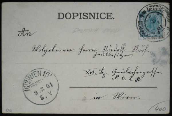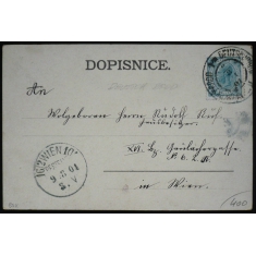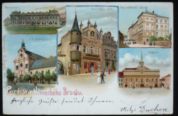 litografická koláž, nemocnice, radnice, škola, Havlíčkův dům, vydal Švejda, prošlá, dlouhá adresa, Q2