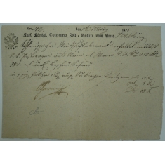 úřední potvrzení o zaplacení poplatku za noviny v částce 1 zlatý a 4 krejcary, vydáno v Brně; hezké