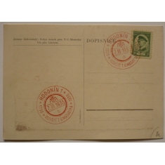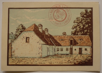 3 příležitostná razítka na pohlednici, rodný domek prezidenta, autor J. Dobrovolský, dle původního linorytu