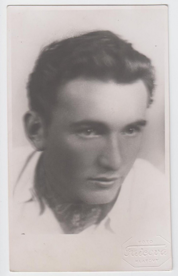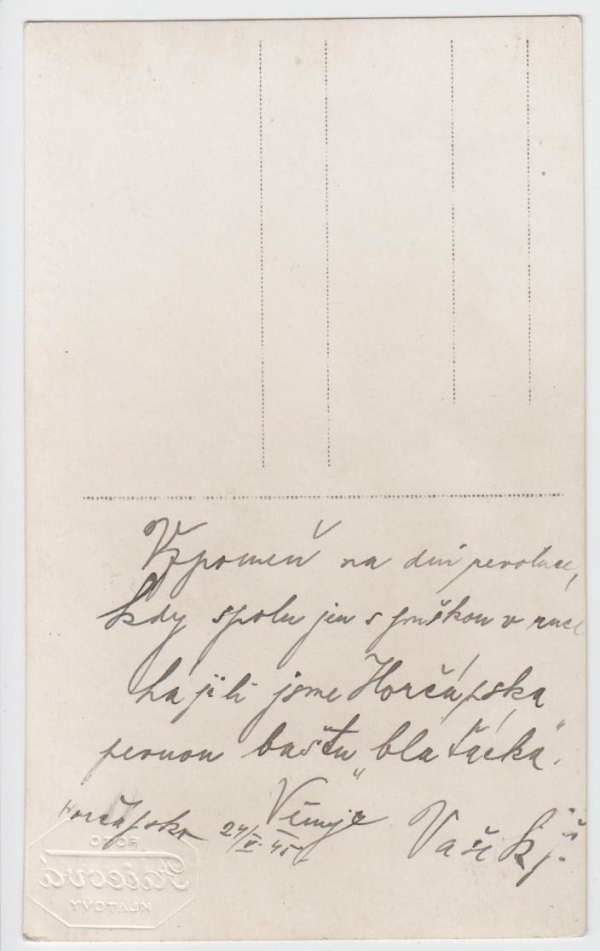 text: Vzpomeň na dni revoluce/ kdy spolu jen s puškou v ruce/ hájili jsme Horčápska/ pevnou baštu "blaťácka"/ Věnuje Vašek/ Horčápsko 24/V 45; zajímavý dobový doklad, foto: Faicová, Klatovy