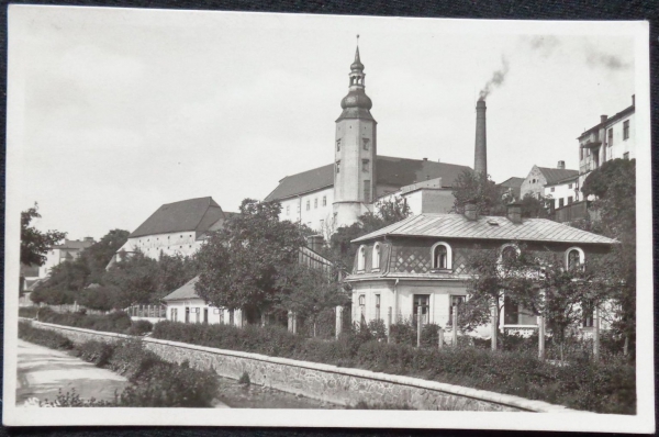 fotopohlednice, pohled ke kostelu, neprošlá, stržená známka, Q1