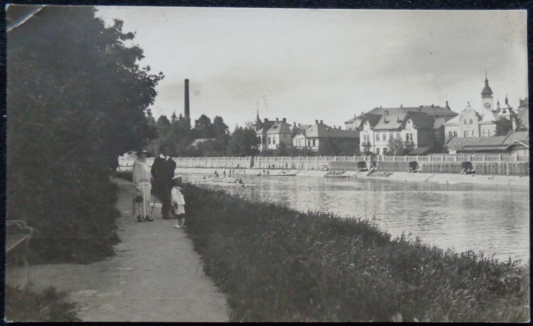 fotopohlednice, pohled přes řeku, lidé, prošlá, Q3 - zlomený roh