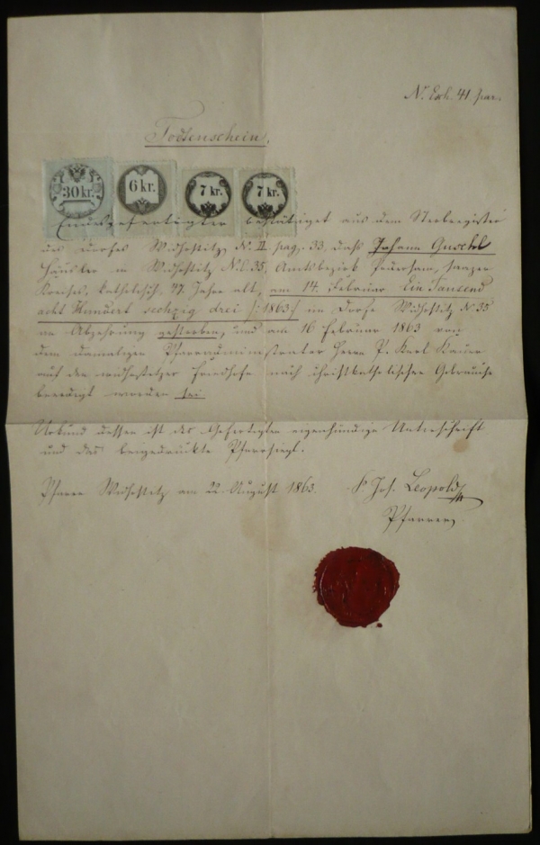 30Kr + 6Kr + 7Kr + 7Kr, úmrtní list; křížový sklad