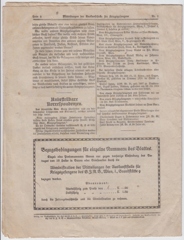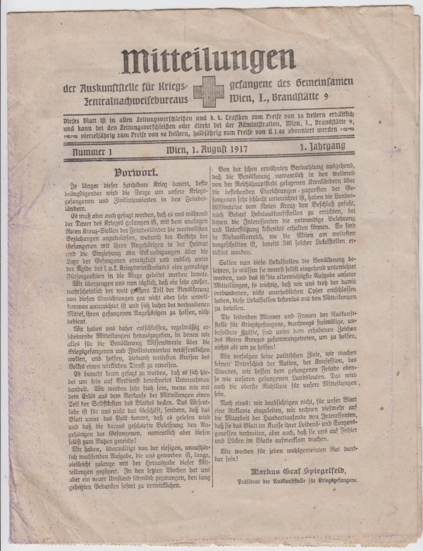 Mitteilungen der Auskunftsstelle für Kriegsgefangene, Wien, první ročník, 8stránková tiskovina