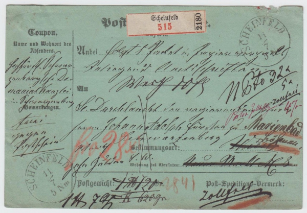 šlechtická korespondence, poštovní průvodka na Jana A. Schwarzenberka, SCHEINFELD 11/7, dosíláno, MARIENBAD 18/7/14