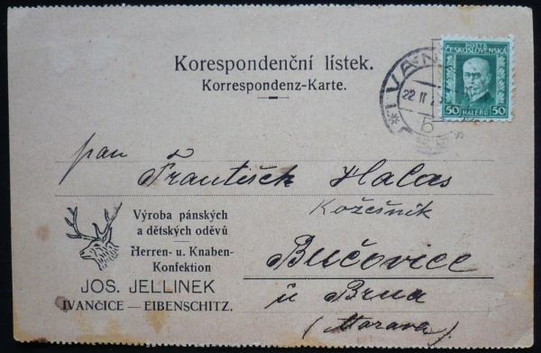 výroba oděvů, reklamní přítisk na korespondenčním lístku do Bučovic, razítko IVANČICE 22.II.29, lehké skvrny