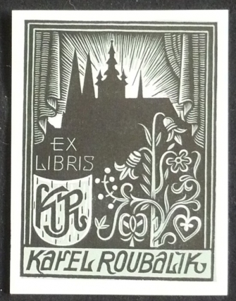 Baruch, Jožka: exlibris Karel Roubalík, 10x13cm, pohled z okna na chrám Sv. Víta