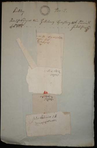 1803 Judaika, česky psaná listina s přilepenými 4 lístky psanými hebrejsky