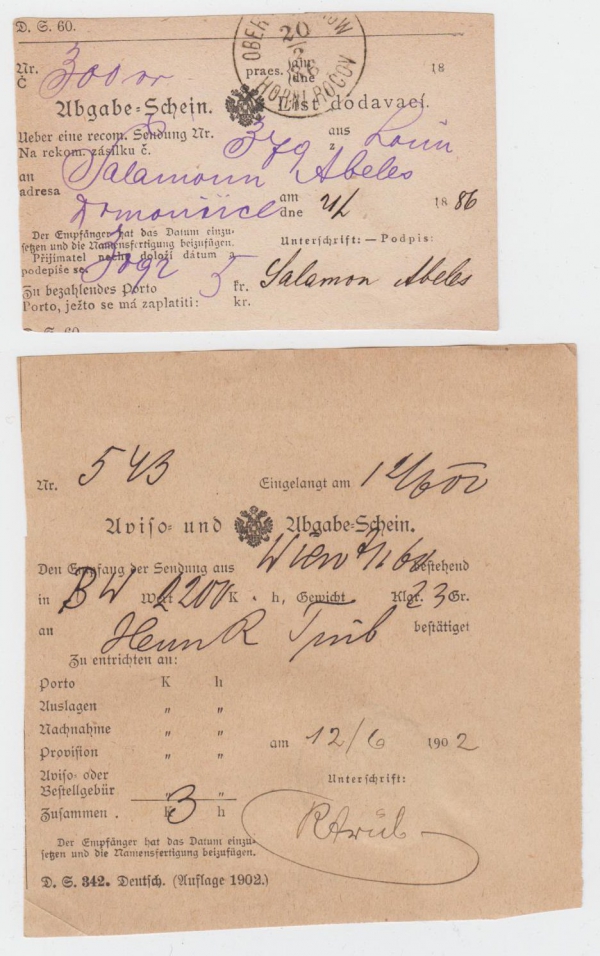 sestava 2 vkladních lístků, mj. Herr Salomon Abeles, Domoušice