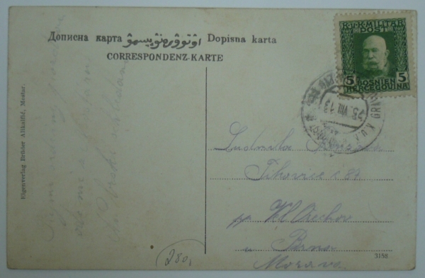 pohlednice Mostaru se známkou přepravená polní poštou na Moravu, podací razítko K.u.K. BAHNPOST II./ GRAVOSA - SARAJEVO 116/ 25.VIII.13, vzácné razítko, lehčí otisk