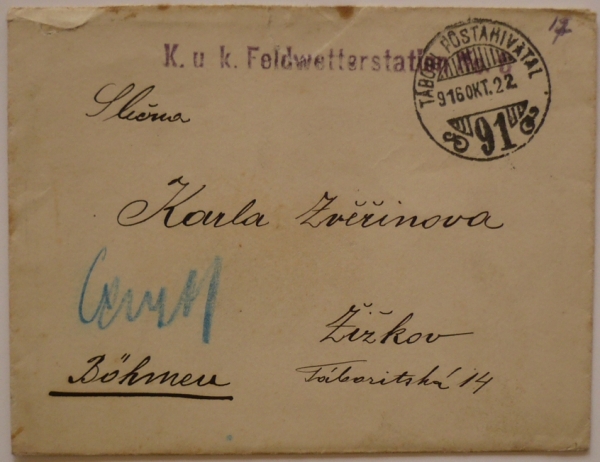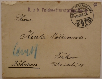 řádkové razítko polní povětrnostní stanice, FP 91/ 22.X.16, natrženo v okraji
