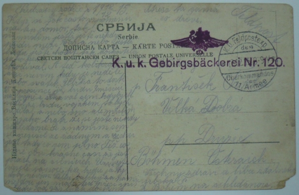 útvarové razítko horské pekárny, K.D. FELDPOSTEXP./ DES OBERKOMMANDOS DER 11. ARMEE, zajímavá pohlednice z města Leskovac (Srbsko); utržený růžek