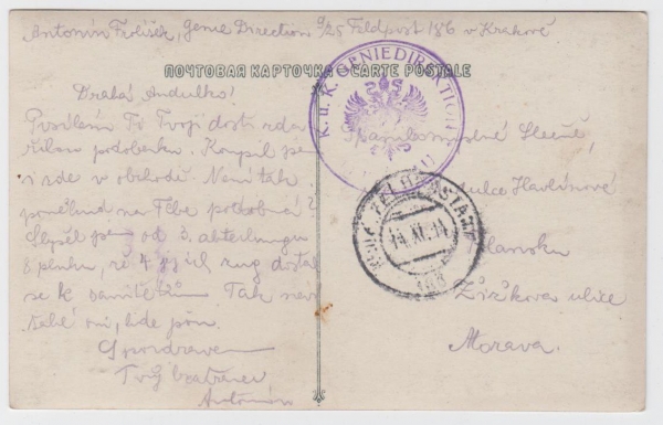 K.u.K. MFPA POLA, K.u.K. ELEKTRO-KOMP. aj., cenzura, razítko "VON DER ARMEE IM FELDE"; zachovalé
