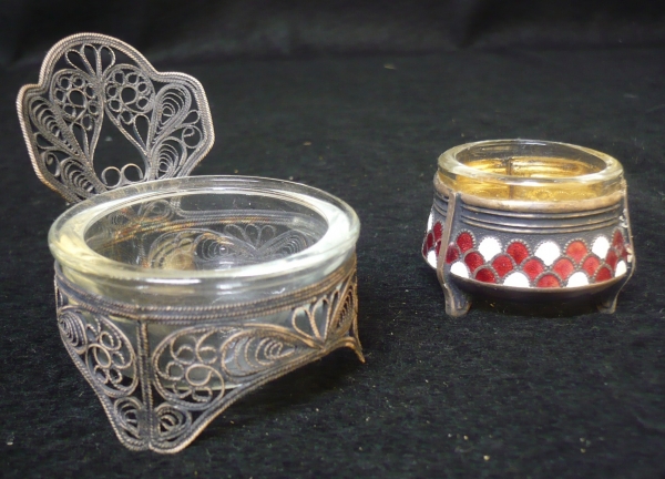 sestava 2 kalamářů, kombinace materiálů - sklo + kov, průměr 5cm a 3,5cm; velmi hezké