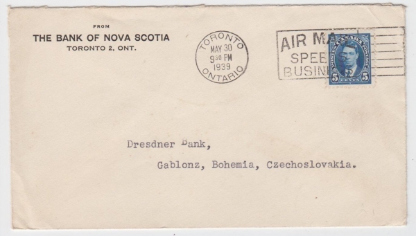 adresováno do ČSR, TORONTO 30.MAY 1939