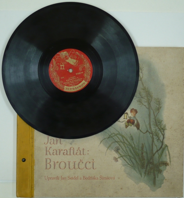 5 gramofonových šelakových desek v původním albu, třetí je rozbitá, ilustrace Jiří Trnka
