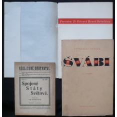 Horálek: Spojené státy světové, vlastním nákladem, Praha, 1924; Nezval: Švábi, vydala Svoboda, Praha, 1945; Beneš: President Dr. Edvard Beneš Sokolstvu, vydal Sokol, Praha, 1948