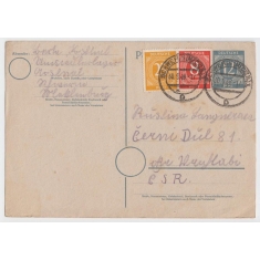 korespondenční lístek do ČSR, tříbarevná frankatura, přesídlenecký tábor (Umsiedlerlager) Arsenal, Schwerin, razítko SCHWERIN 30.9.46