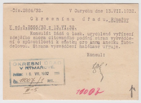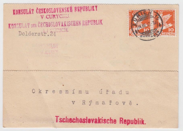 1932 Konzulární pošta, Konzulát ČSR v Curychu