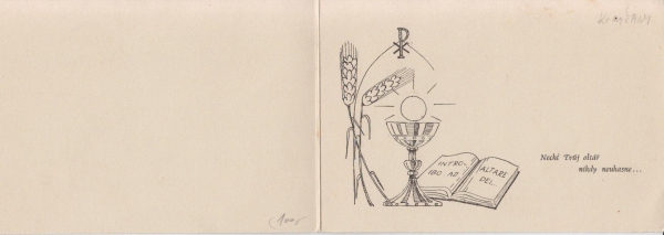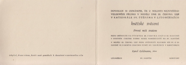 1958 Koryčany, pozvánka na kněžské svěcení, Karel Goldmann