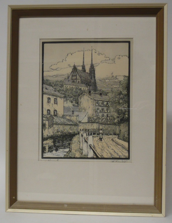 Koubek, Karel (1896–1940): Brno, pohled na Petrov - dřevoryt, signováno