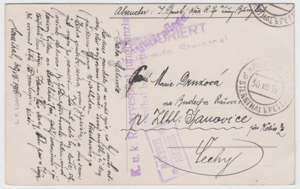 K.u.K. MFPA POLA, K.u.K. ELEKTRO-KOMP. aj., cenzura, razítko "VON DER ARMEE IM FELDE"; zachovalé