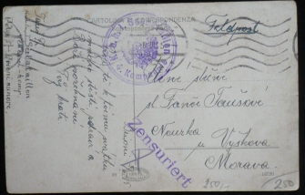 K.u.K. I. Seebattalion/ 4. Kompagnie, na pohlednici na Moravu, řádkové razítko ZENSURIERT; odřené rohy