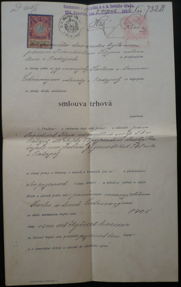 kolek 1K emise 1898 v záhlaví a 72h emise 1898 v závěru smlouvy, znehodnoceno přepisem a razítkem, hezké