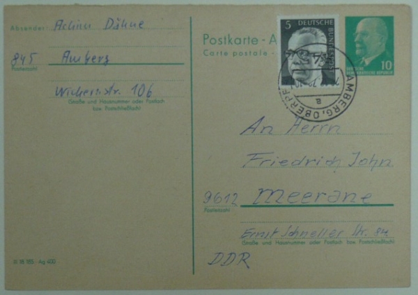 dopisnice NDR použitá na území SRN, frankováno západoněmeckou známkou 5Pf, razítko AMBERG 28.12.72 (Západní Německo), adresováno do Meerane (Východní Německo); velmi zajímavé