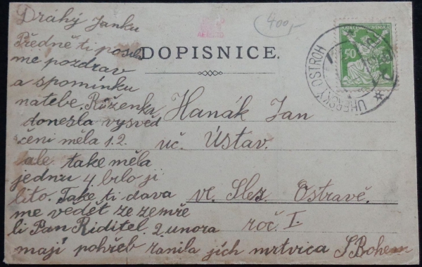 Josef Šváb č. 506, barevná litografie, pomník K. H. Borovského, prošlá později, dlouhá adresa, Q3 - podřená