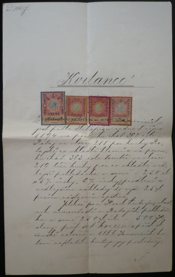 vícenásobná frankatura 1K, 50h, 30h a 8h emise 1898 v záhlaví a 72h emise 1898 v závěru smlouvy, znehodnoceno přepisem a razítkem; dekorativní