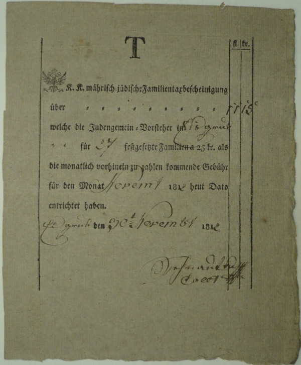 potvrzení o zaplacení poplatku židovskou obcí v Lednici