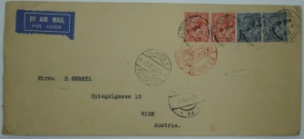 razítko LONDON 6.7.33, červený kruhový kašet LUFTPOSTAMT BERLIN, příchozí razítko WIEN, natrženo na adresní straně