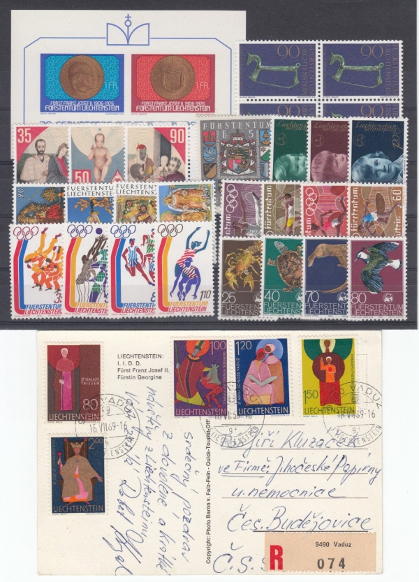 MICHEL 3l.10 + 556-59, 590, 620-22, 644-47, 648 (čtyřblok), 651-54, 662-65 a 954-56, s námětem Dětem, Fauna, Vánoce, Sport, vše lzxusní, k tomu R pohlednice do ČSR se známkami 492-494, 501-502, VADUZ 16.7.1969