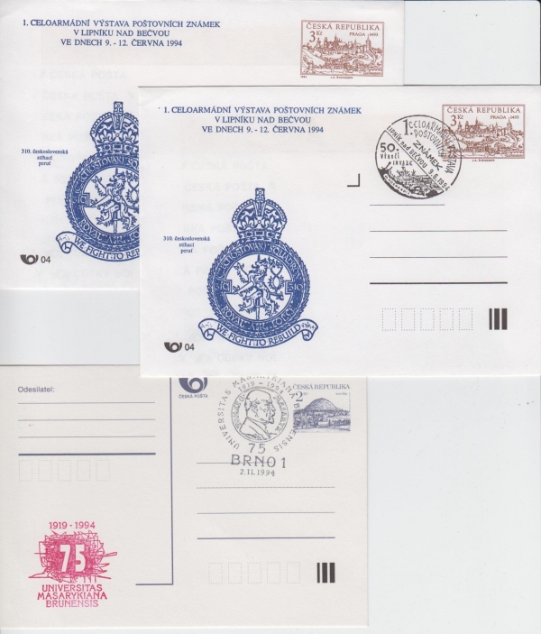 sestava 3 celin s přítiskem, 2x celinová obálka 1. CELOSTÁTNÍ VÝSTAVA POŠTOVNÍCH ZNÁMEK V LIPNÍKU NAD BEČVOU, 1x s příležitostným razítkem a 1x bez, UNIVERSITAS MARARYKIANA BRUNENSIS 1919-1994, 75 let, dopisnice s příležitostným razítkem