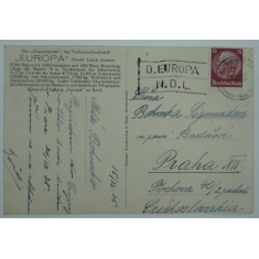 pohlednice parníku "EUROPA" zaslaná do Prahy se známkou Hindenburg 15Pf, kulaté razítko DEUTSC - AMERIK. SEEPOST/ BREMEN-NEW YORK/ 19.12.35, kašet D. EUROPA/ N.D.L.; velmi hezké