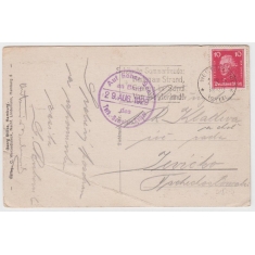 pohlednice do Jevíčka, kašet "Auf hoher See an Bord / Turb. Dampfers Kaiser / 29.AUG.1929; zlomený roh