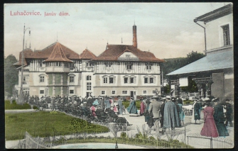 Janův dům, dav lidí před budovou, prošlá, Q2