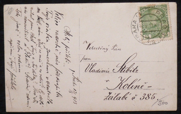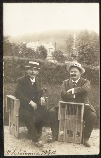 fotopohlednice, muži, v pozadí lázeňský dům Jestřabí, prošlá, Q2