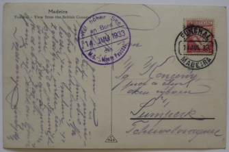za války zrekvírovaný, eskortní dvoukomínový parník, pohlednice, kulaté razítko s datem 14.7.1933, podací razítko FUNCHAL/ MADEIRA 14.7.33; velmi hezké otisky, zajímavé z hlediska válečných událostí