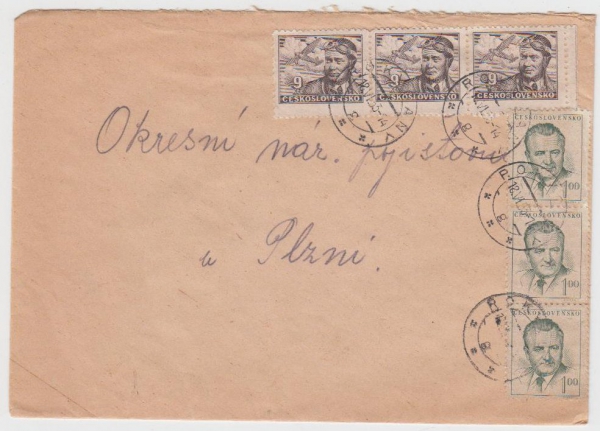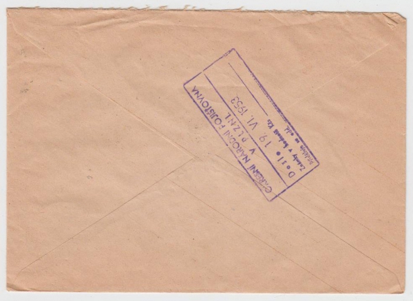 dopis do Plzně, ROKYCANY 18.VI.53, vzadu vzadu razítko 19.VI.1953