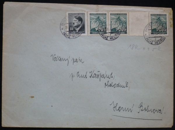 dopis s meziarším, VELKÉ MEZIŘÍČÍ 24.III.43; natržená klopa