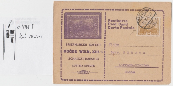 korespondenční lístek s firemním přítiskem, se známkou 498 s deskovou vadou - viz foto