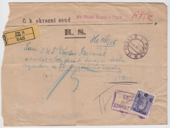 jednoznámková frankatura na soudním dopise, PRAHA 23.II.18; křížem přeloženo